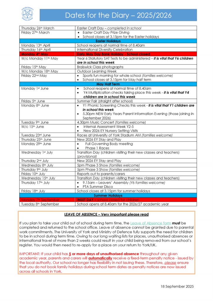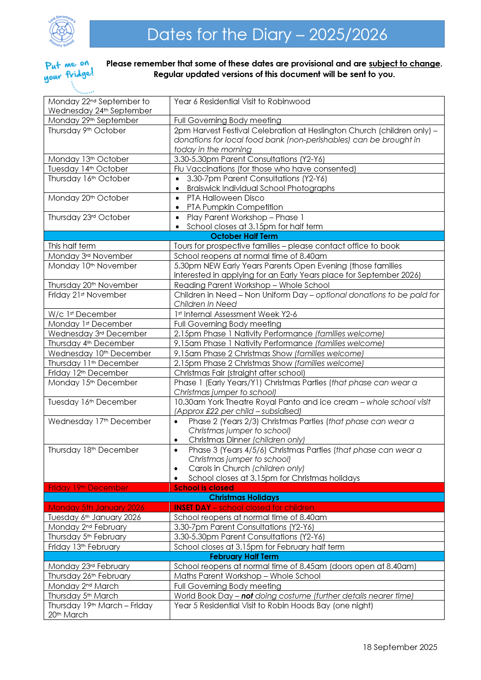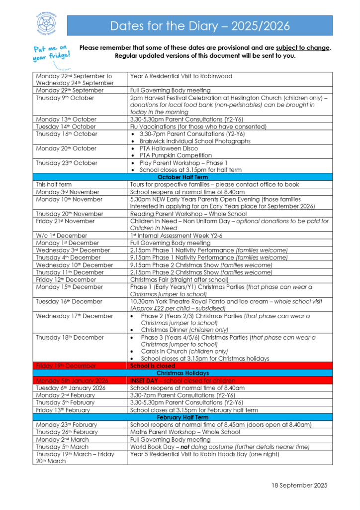 Please click here to download Dates for Diary 2025-2026 (last updated 18-9-25) as a .pdf